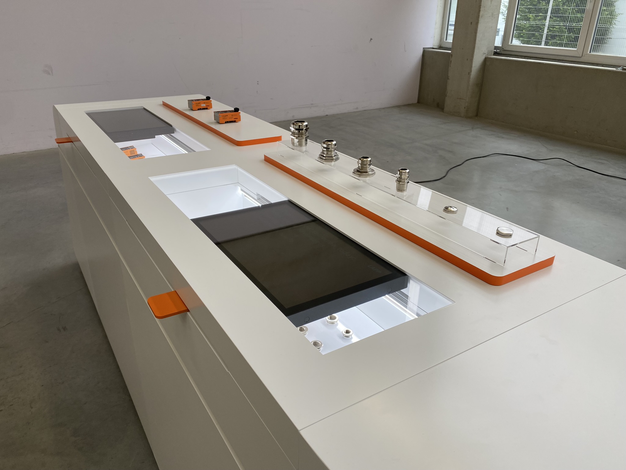 Feasibility study, concept support, technical planning, UI/UX design, implementation and the programming of an interactive exhibit for presenting U.I. Lapp GmbH’s new product details at trade shows. The table consists of three stations with a new product series presented in each. The products are presented live with an additional level of content being experienced via the digital surface.