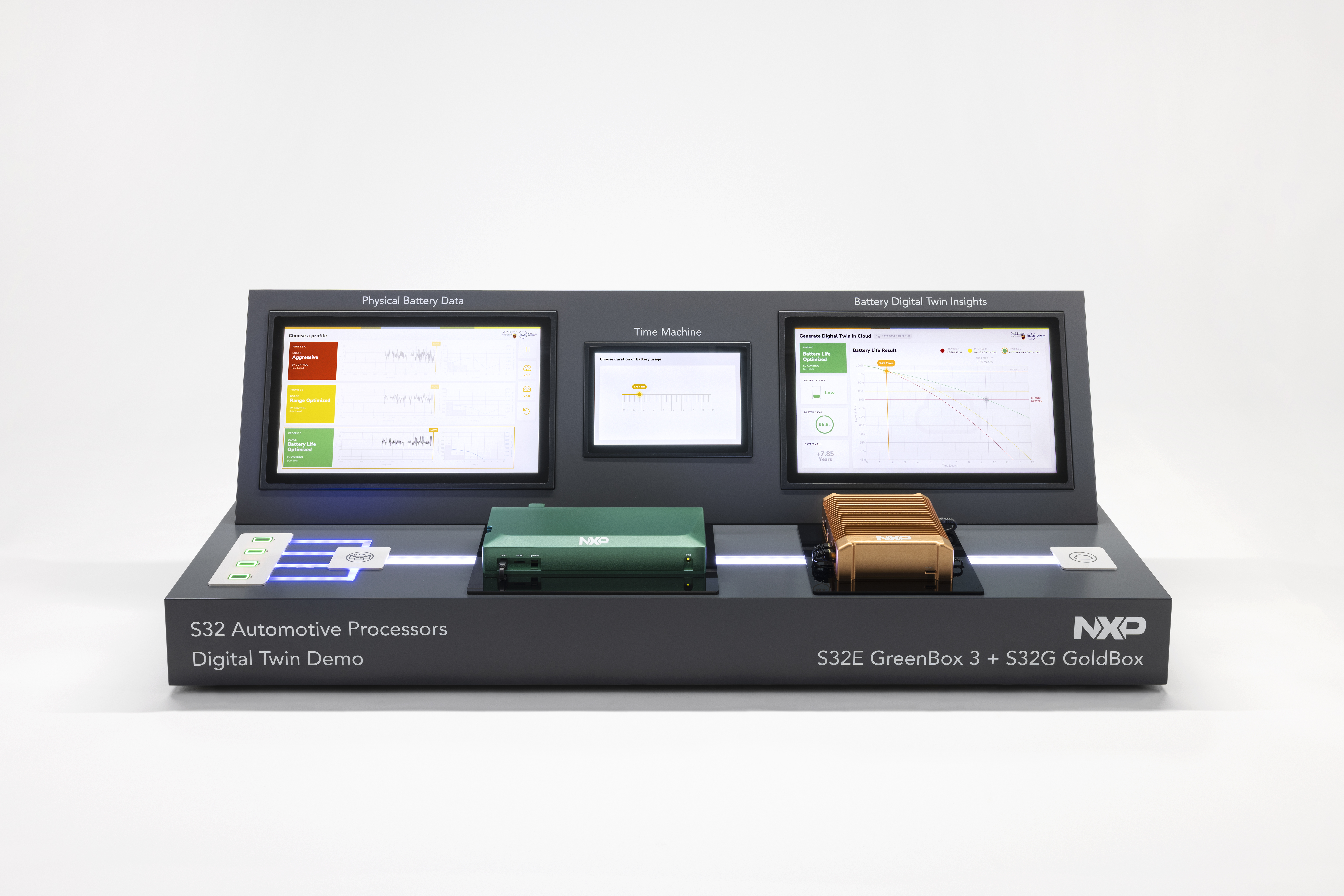 Konzeptunterstützung, Konstruktion und Produktion der interaktiven Tabletop-Demo zum Thema Digital Twin am Beispiel des Batterie Managements eines Elektroautos und der davon abhängigen Lebenserwartung der Batterie. Konzipiert als mobile Demo im Flightcase für einen regelmäßigen weltweiten Einsatz. Programmierung aller User-Interfaces und Interaktionselemente sowie der LED-Szenarien in Abhängigkeit der Interaktionen, Einbindung proprietärer Kunden-Hardware.